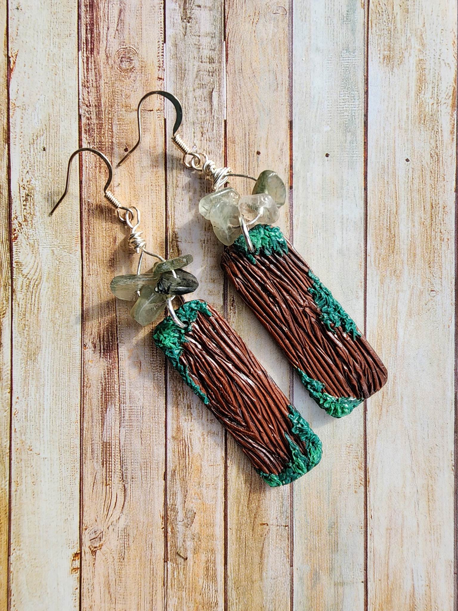 Breloques imitiation de bois, ornées de petits cristaux de labradorite.