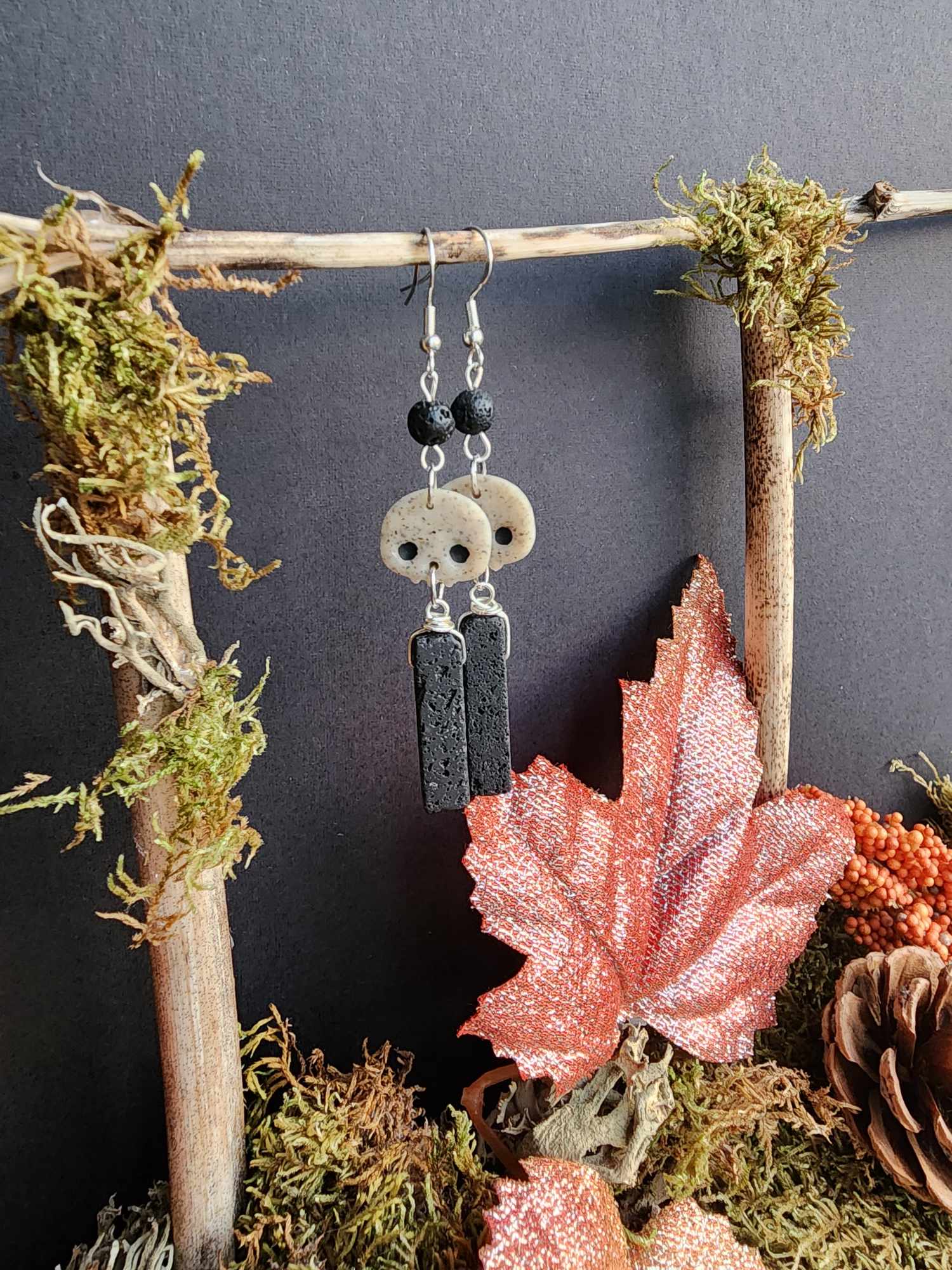 Boucles d'oreilles longues, avec petit crâne en pâte polymère. Agencer à une perle et une pierre de lave. Crochets argentés.