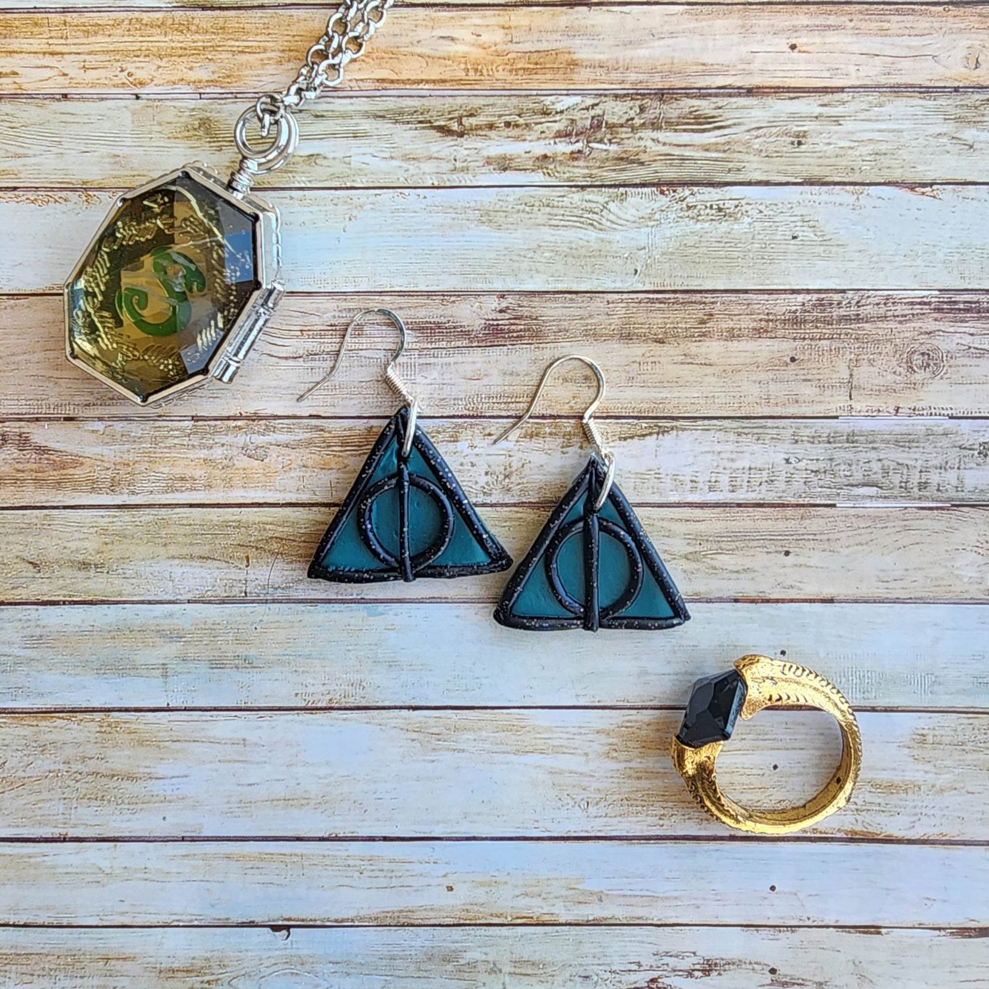 Petites reliques de la mort noires scintillantes, sur fond aux couleurs de la maison de l'ambition : Serpentard. Environ 1/2''.