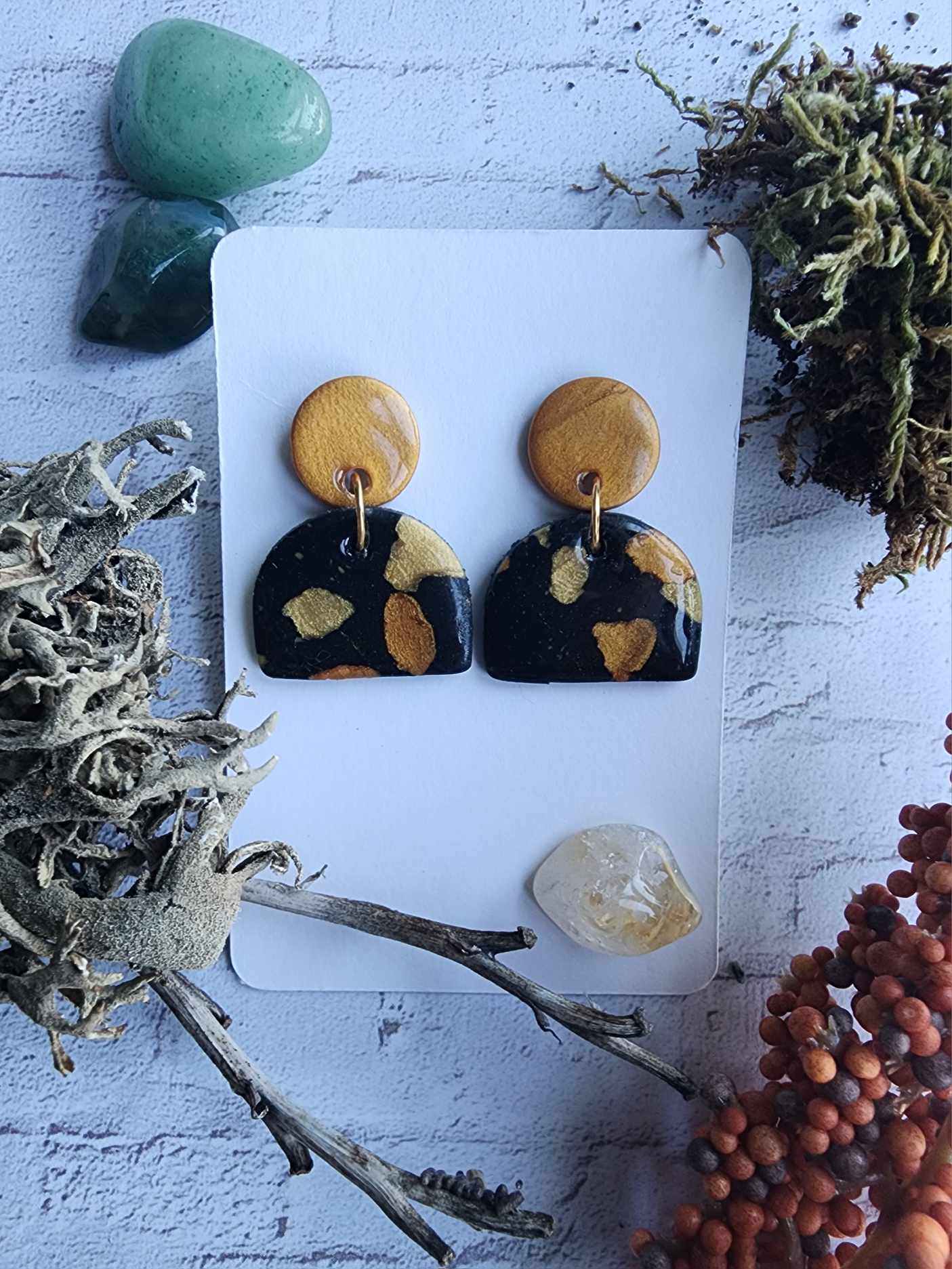 Boucles d'oreilles courtes effet terrazzo doré et cuivré. Agencé à un petit earstud doré.